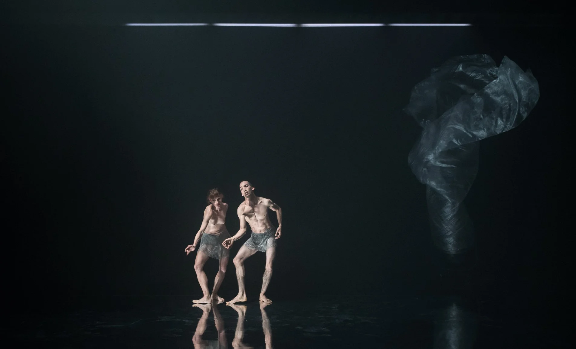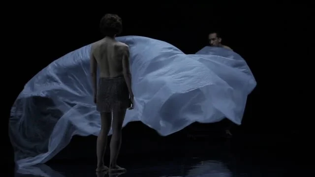 The scenography also incorporates waves of light, shaped by lightweight wooden structures designed in collaboration with the lighting designer. These structures direct the flow of light, creating plays of shadows and reflections that highlight the movements of both the sheet and the performers. A mirrored floor extends these reflections, multiplying perspectives and expanding the stage space. This addition brings a dreamlike dimension where bodies and materials appear to blend in infinite resonance.
